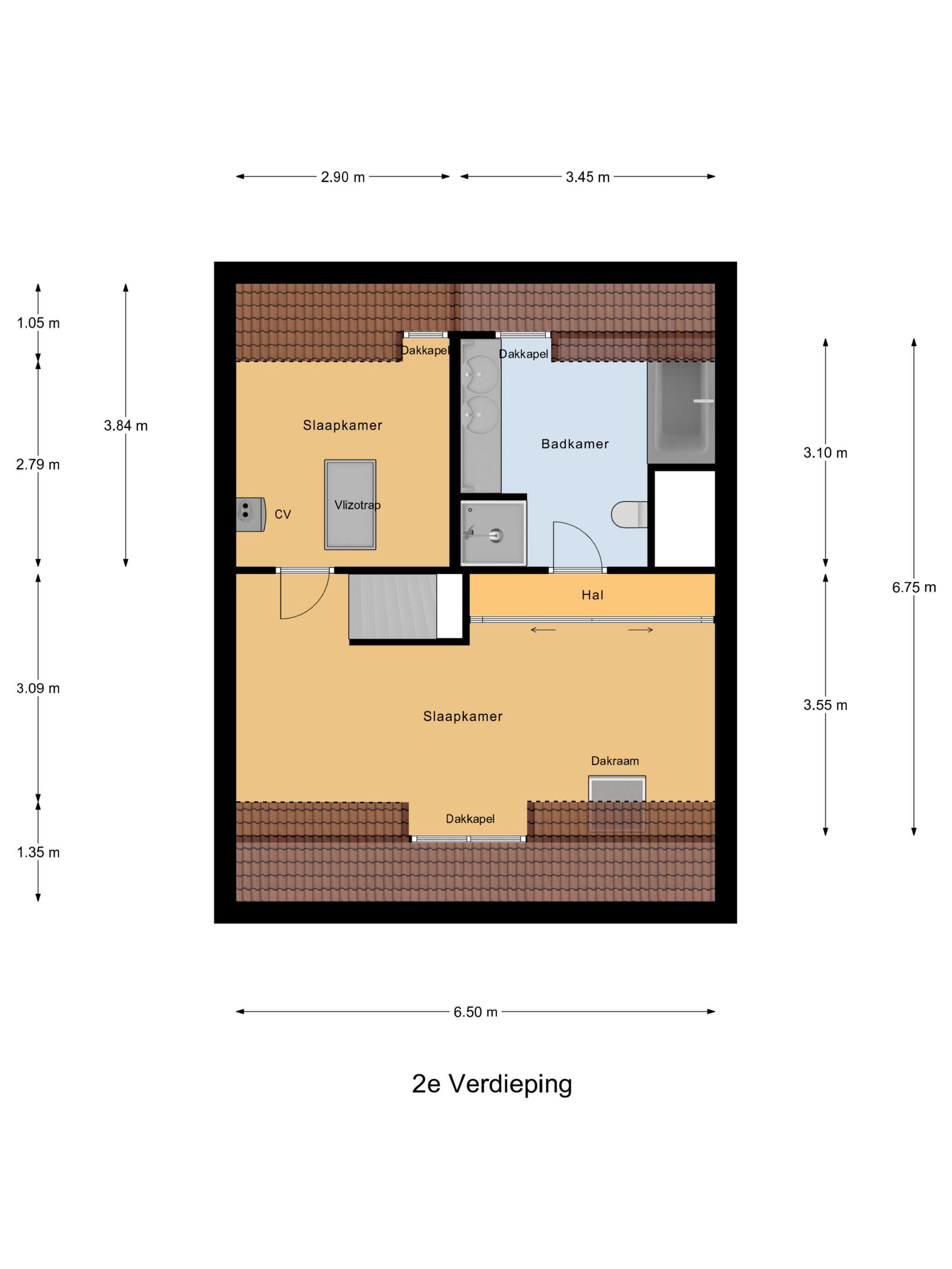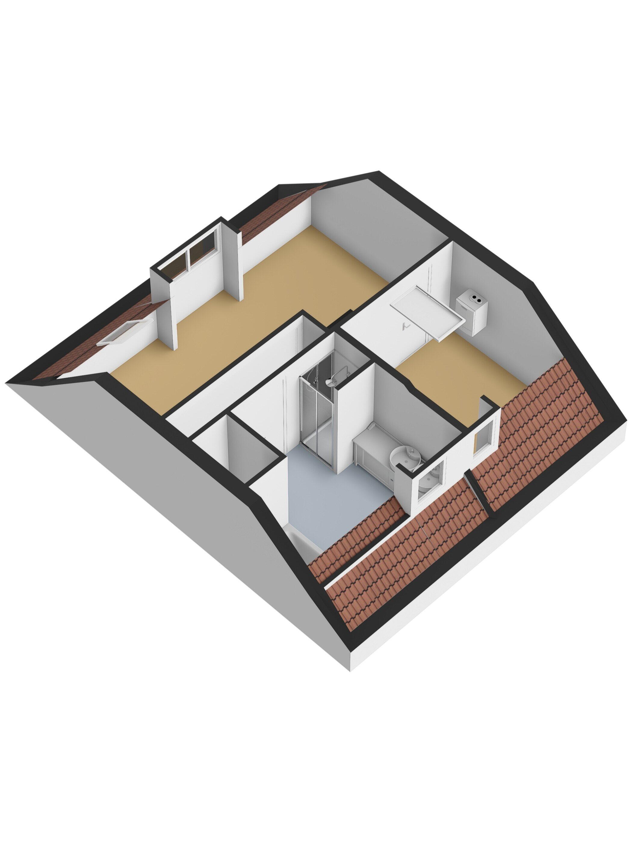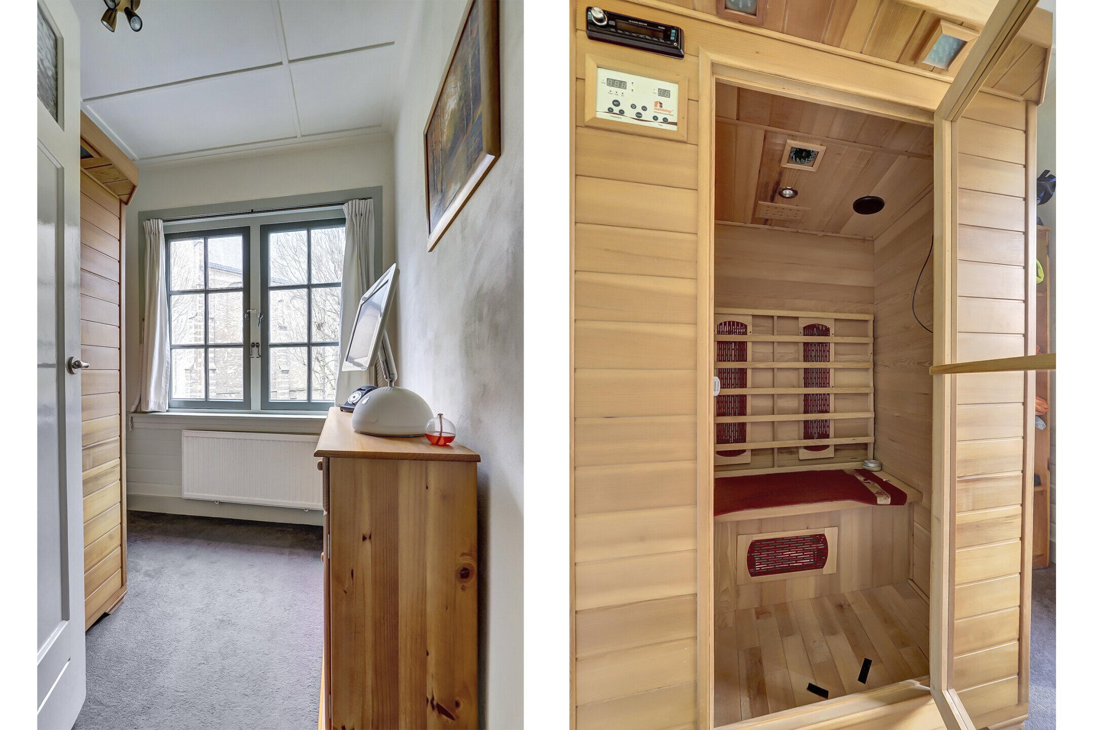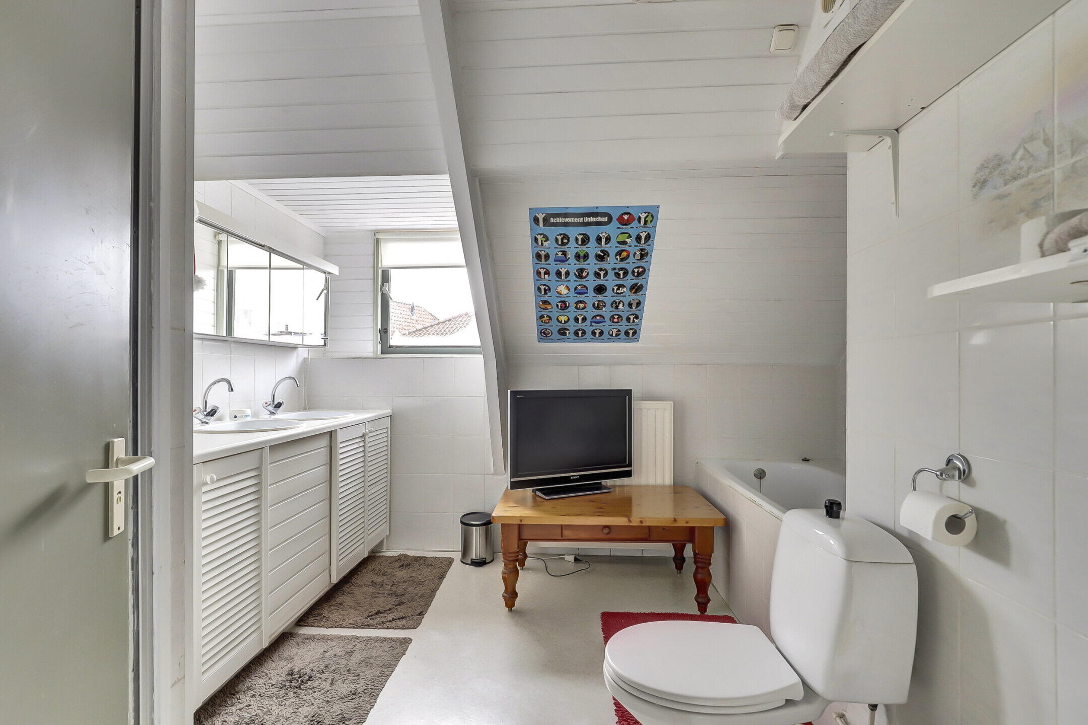 Tweede verdieping: grote voorzolder met dakraam en dakkapel waar eenvoudig een separate slaapkamer kan worden gemaakt en toegang geeft naar de tweede badkamer met ligbad, douche, wastafelmeubel en een derde toilet.